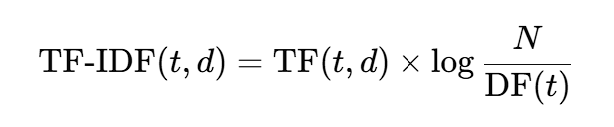 where t is the term, d is the document, N is the total number of documents, and DF(t) is the number of documents containing the term t.