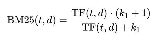 BM25 introduces a concept called term saturation, where the relevance score increases with term frequency but at a diminishing rate. In other words, if a term appears five times in a document, the relevance increase is substantial, but after a certain threshold, additional occurrences contribute less and less to the score. This prevents documents from being unfairly ranked higher solely because of excessively repeated terms. BM25 achieves this using the parameter k1, which controls the term frequency’s impact. The formula is: