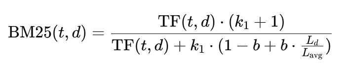 Here, L_d is the document length, and L_avg is the average document length across the collection. The parameter b (typically between 0 and 1) controls the degree of length normalization.